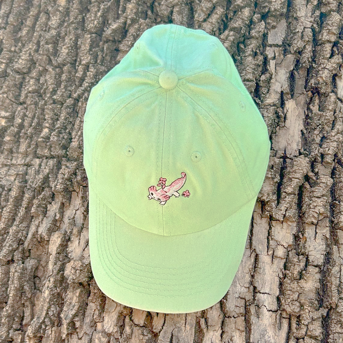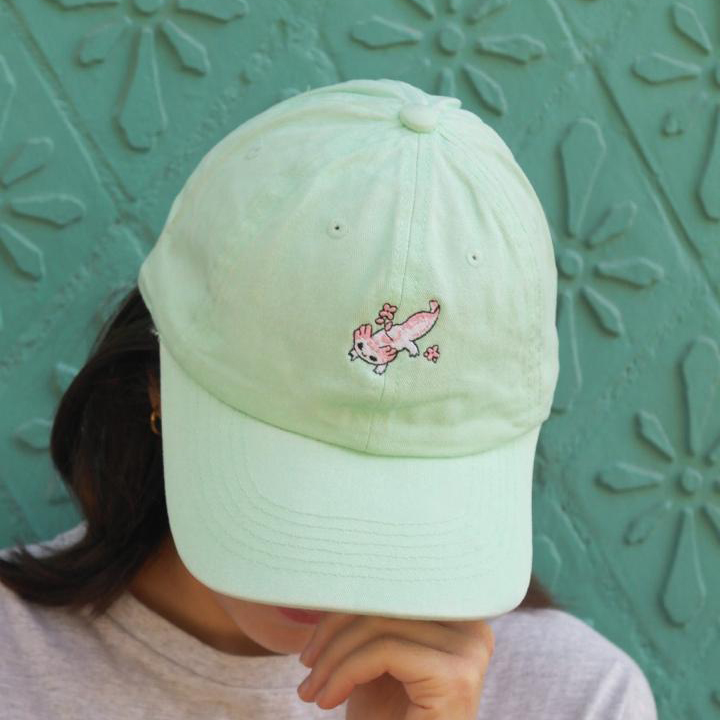 Gorra estilo béisbol en color menta deslavado, ideal para el día a día. Presenta un bordado de axolote en la parte frontal.