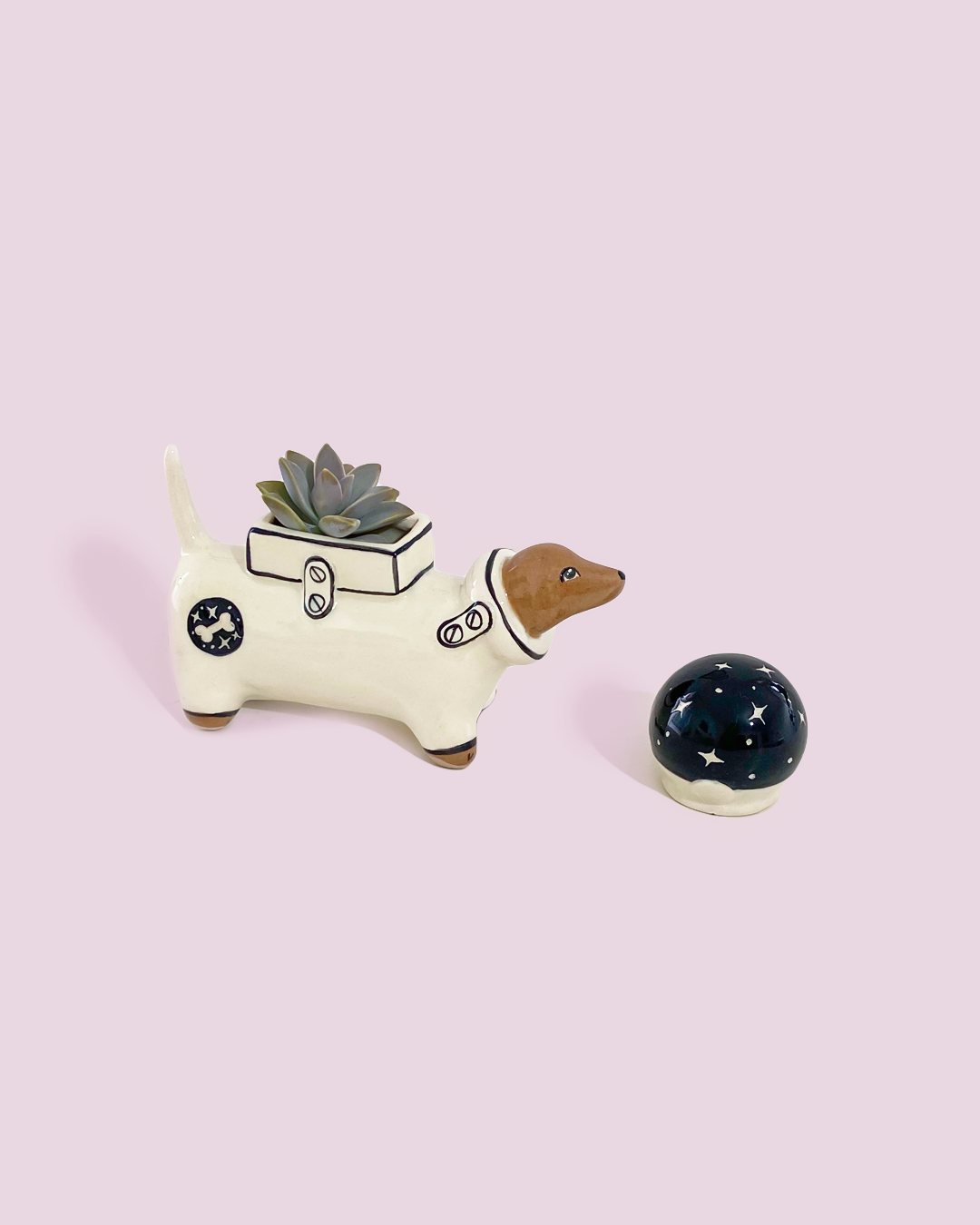 Salchinauta$590.00 Maceta de perrito salchicha astronauta con casco de cerámica (se puede quitar y poner) , cerámica hecho a mano. Al ser piezas hechas a mano, puede existir variación entre una y otra. *NO INCLUYE PLANTA* Hay existencias Salchinauta cantidad Añadir al carrito SKU: SalchinautaMEd Categoría: Maceteo Galáctico